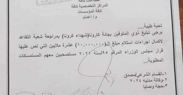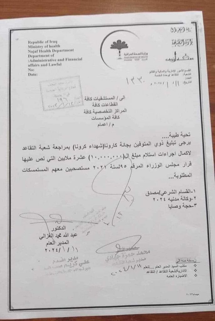🔹ئەنجوومەنی وەزیرانی عێراق لەساڵی 2021 بڕیاری ژمارە 95ـی دەرکرد، کە تایبەت بوو بە پێدانی 10 ملیۆن دینار بە کەسوکاری ئەو پزیشک و کارمەندانەی تەندروستی کە لە سەردەمی بڵاوبوونەوەی کۆرۆنا گیانیانلەدەستدا، ژمارەی ئەوان بەپێی وەزارەتی تەندروستی 214 پزیشک و کارمەندن.
